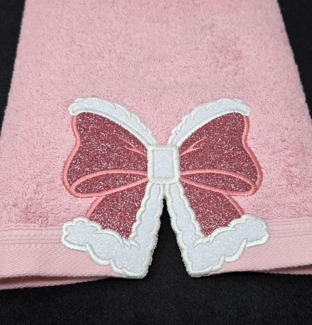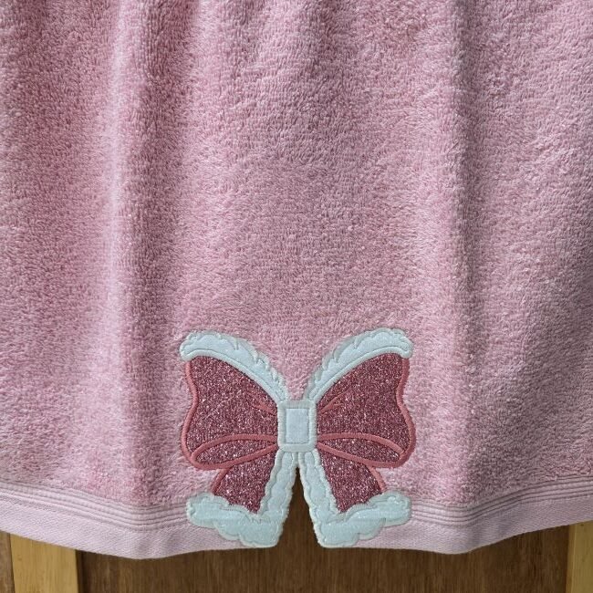 • Festive Design: Features a holiday embroidered pink glitter bow on pink terry cloth.